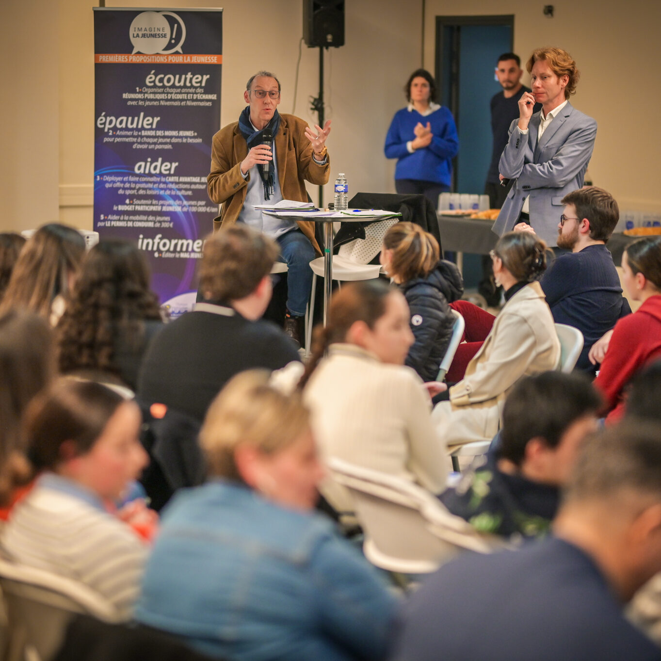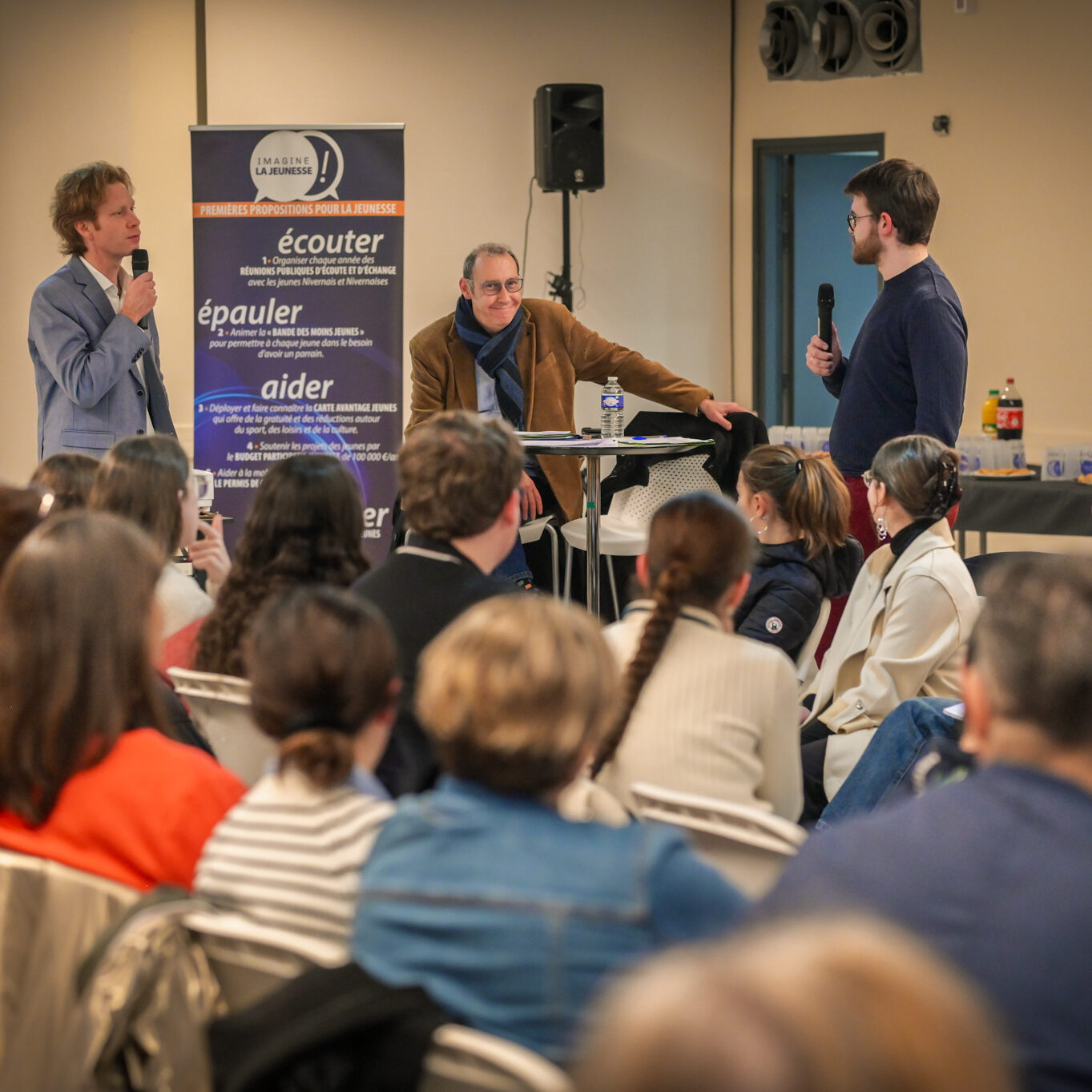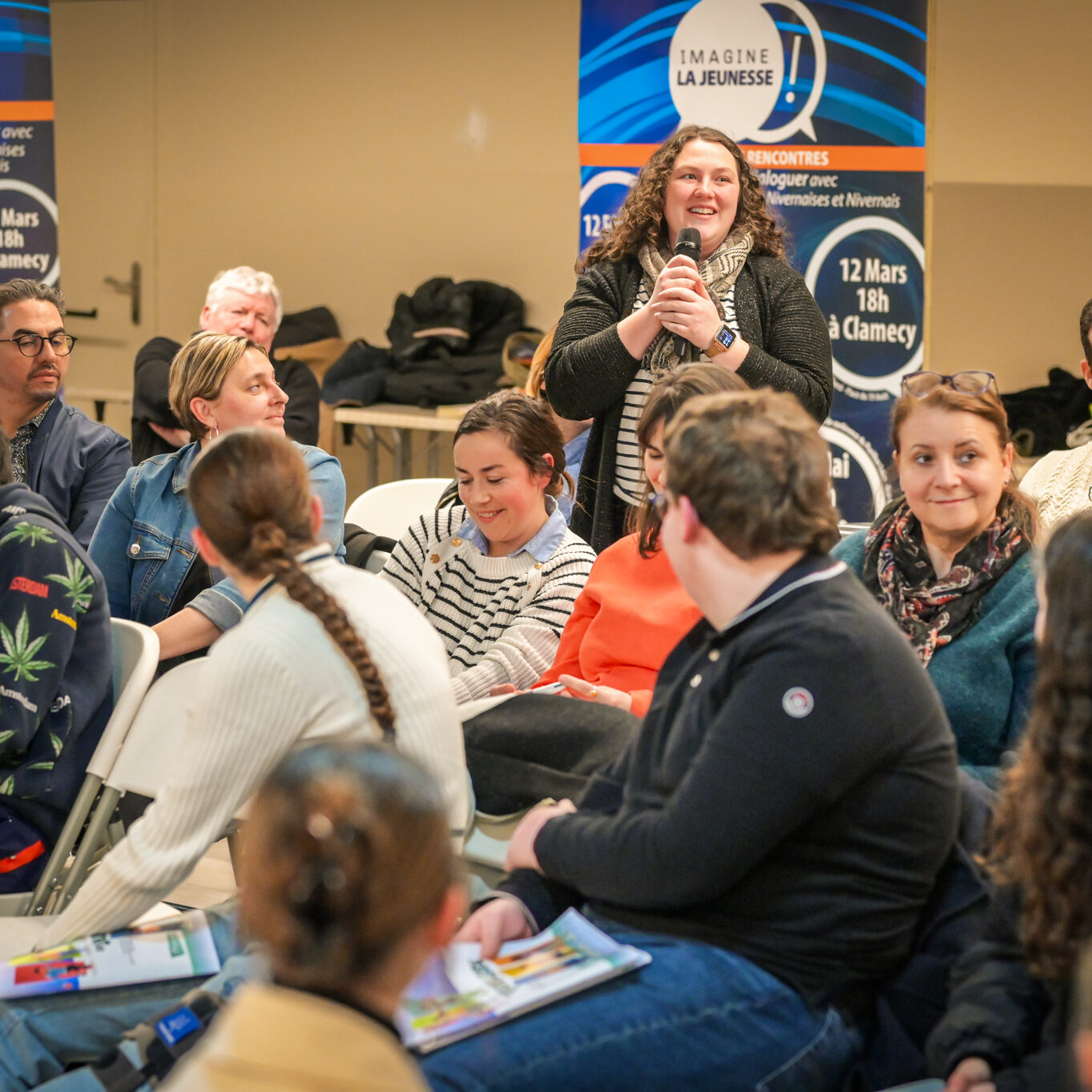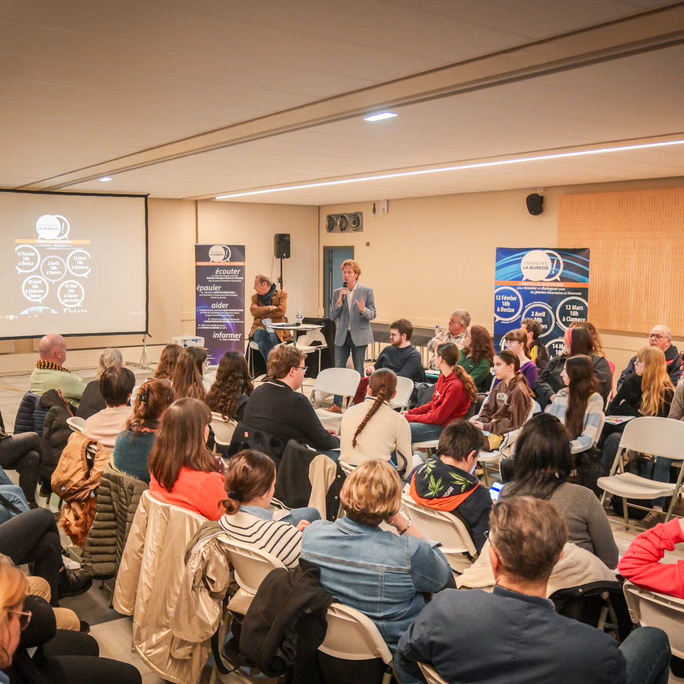« Une salle qui est remplie de jeunes, c’est assez rare pour être souligné », souligne en préambule Justine Guyot, maire de Decize et vice-présidente du Conseil départemental, qui lève les timidités de l’auditoire en témoignant de son parcours : « J’ai eu mon premier mandat électif à 26 ans, ça prouve qu’il faut croire en la force de sa jeunesse. À Decize, on est très attachés à ces échanges citoyens, au contact direct avec les habitants. On ne peut plus penser les politiques publiques autrement qu’avec les jeunes, et pour les jeunes. »