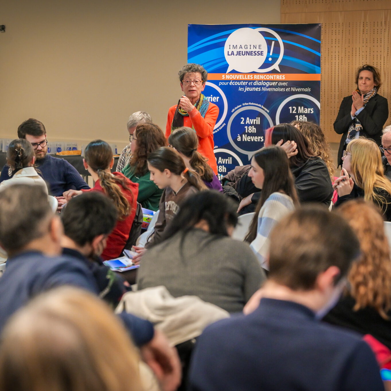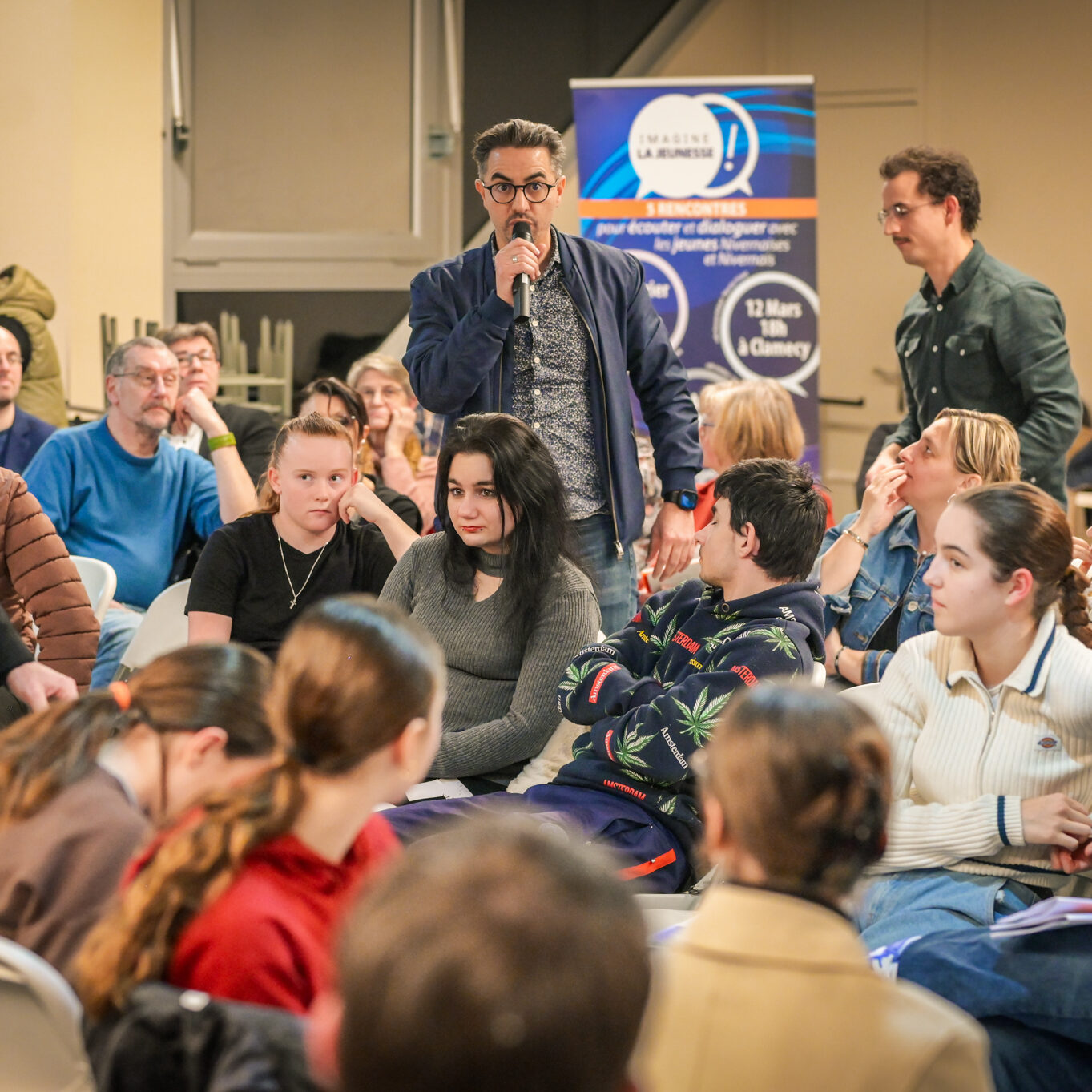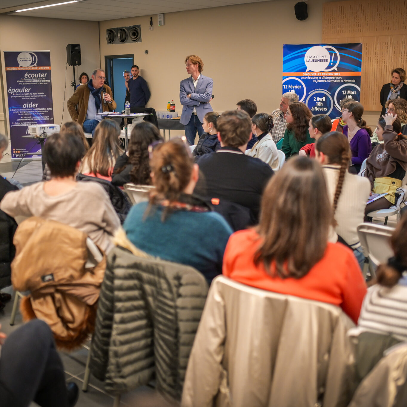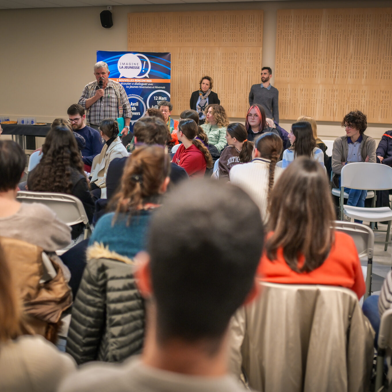 « Une salle qui est remplie de jeunes, c’est assez rare pour être souligné », souligne en préambule Justine Guyot, maire de Decize et vice-présidente du Conseil départemental, qui lève les timidités de l’auditoire en témoignant de son parcours : « J’ai eu mon premier mandat électif à 26 ans, ça prouve qu’il faut croire en la force de sa jeunesse. À Decize, on est très attachés à ces échanges citoyens, au contact direct avec les habitants. On ne peut plus penser les politiques publiques autrement qu’avec les jeunes, et pour les jeunes. »